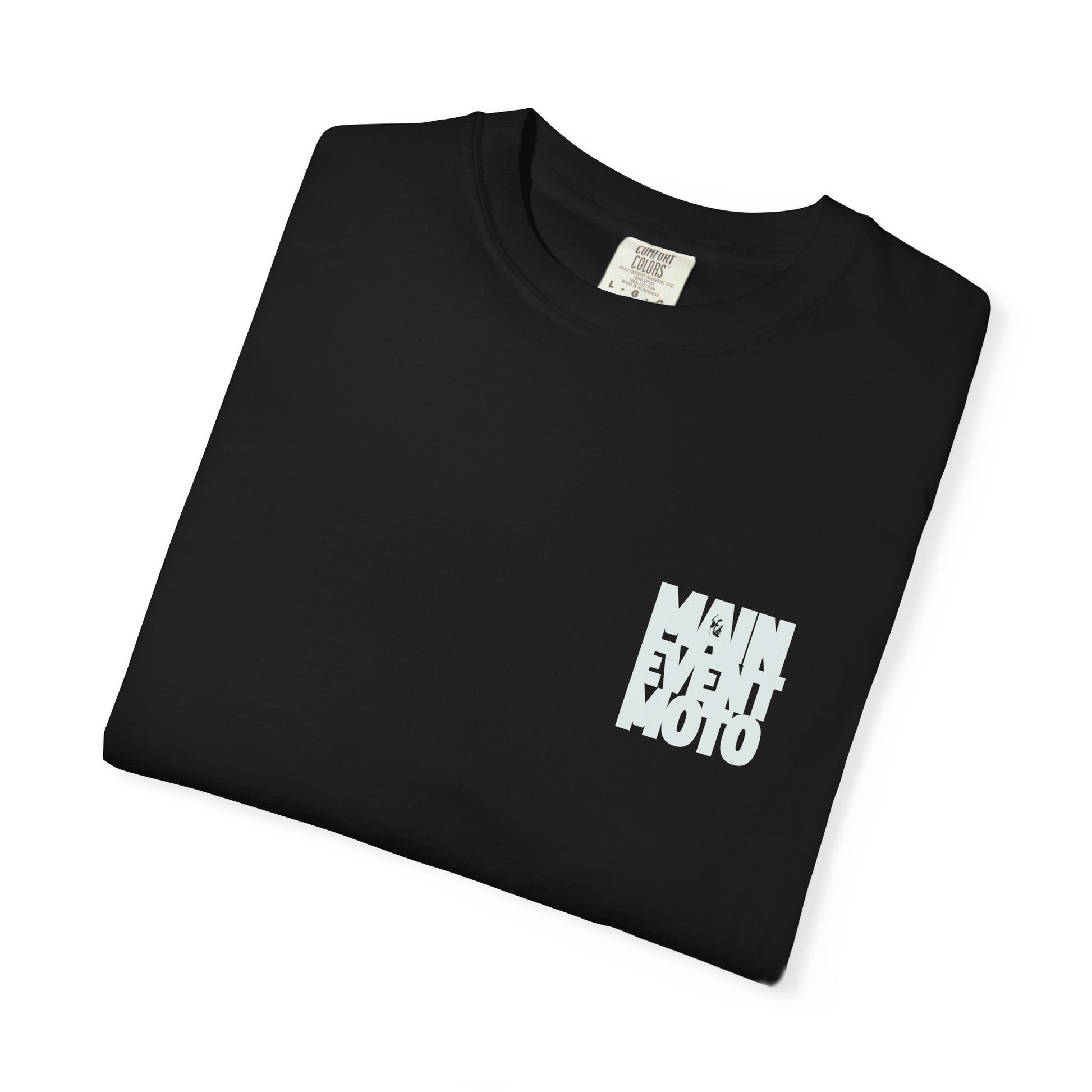 Black t-shirt with Main Event Moto "Big Bore" graphic logo in light gray
